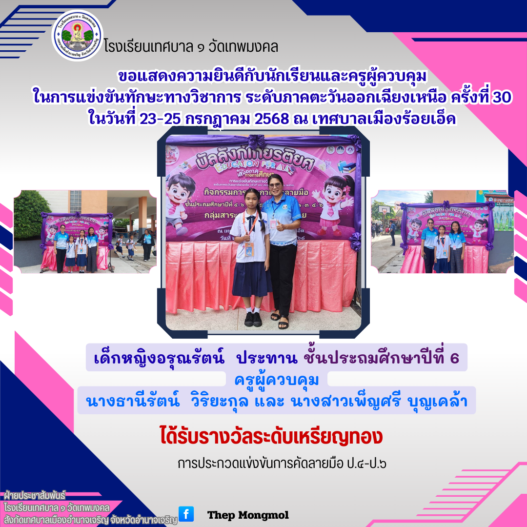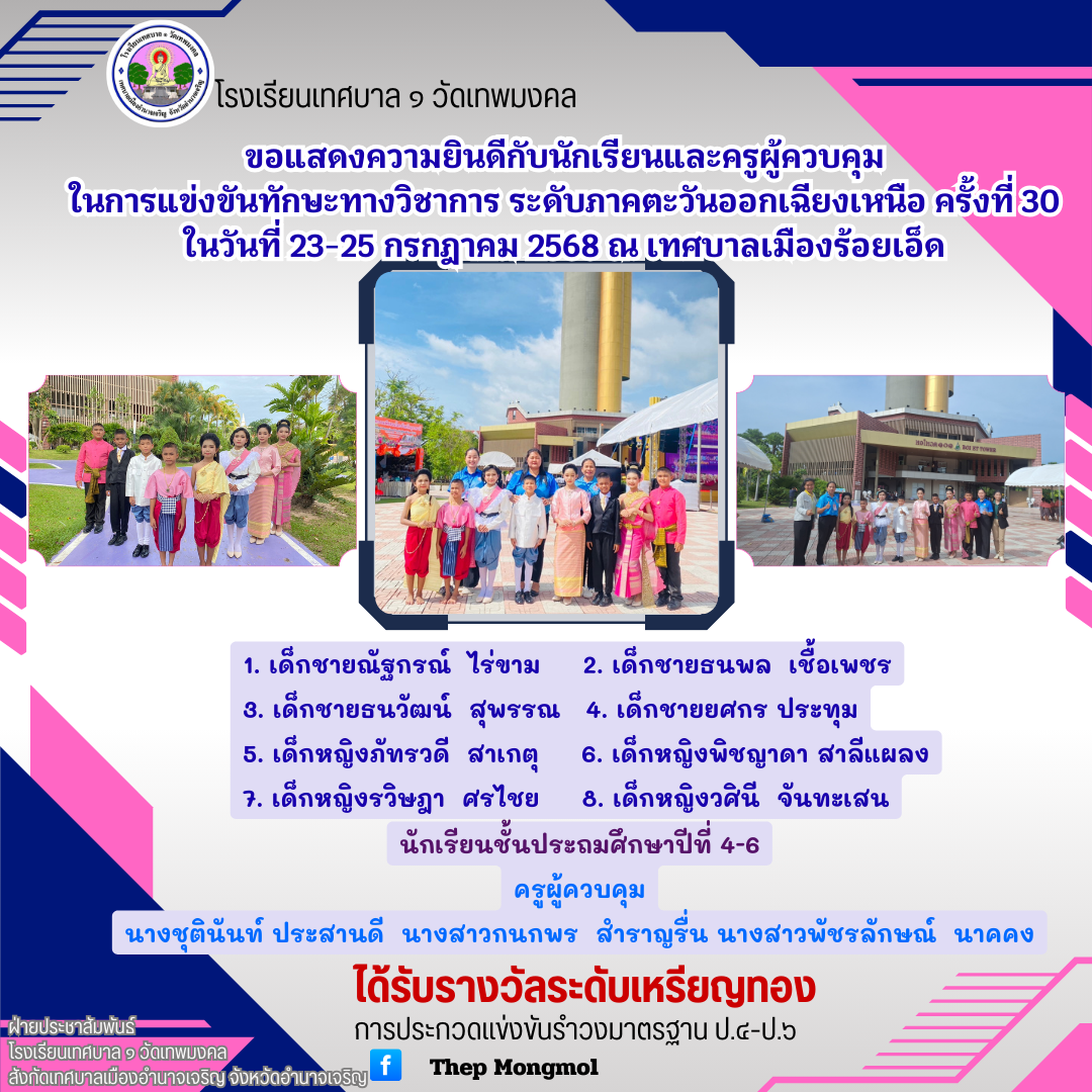 ผู้ได้รับรางวัลในการแข่งขันทักษะวิชาการ ระดับภาคตะวันออกเฉียงเหนือ ครั้งที่ 30 ขอแสดงความยินดีกับนักเรียนและครูผู้ควบคุม ในการแข่งขันทักษะทางวิชาการ ระดับภาคตะวันออกเฉียงเหนือ ครั้งที่ 30 ในวันที่ 23-25 กรกฎาคม 2568 ณ เทศบาลเมืองร้อยเอ็ด